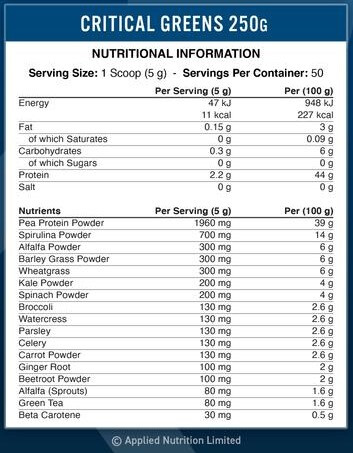 Critical Greens är fylld med 17 extrakt från supergrönsaker, inklusive broccoli, selleri, spenat, vetegräs och grönkålspulver.