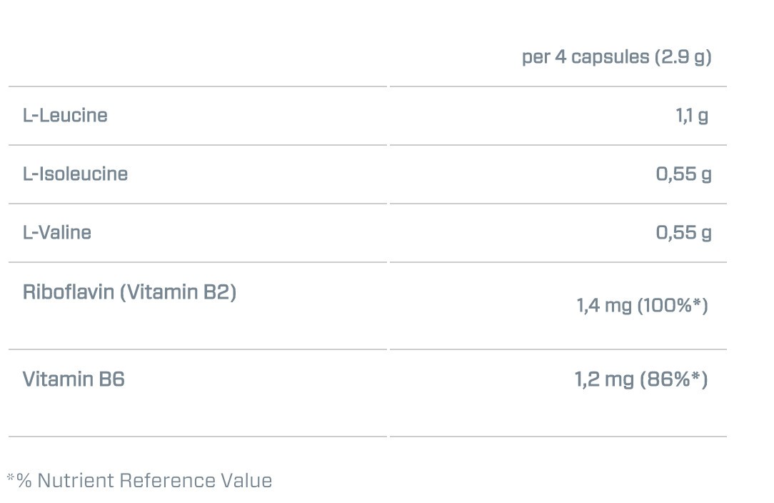 L-Leucine (38%), L-Isoleucine (19%), L-Valine (19%), gelatine, bulking agent (cellulose), anti-caking agent (magnesium salts of fatty acids), antioxidant (ascorbic acid), vitamin B6, riboflavin.