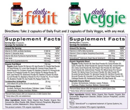 Användning: Ta 2 kapslar av Daily Fruit och 2 kapslar av Daily Veggie med en måltid dagligen.