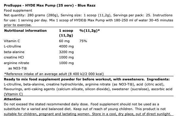 Anbefalld användning: Blanda 1 scoop HYDE® Max Pump med 180-240 ml vatten. Ta 30-45 minuter före träning.