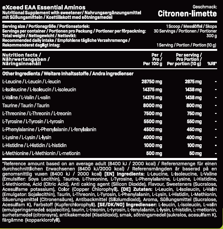 Produktet indeholder hele 6 gram BCAA per portion. Disse aminosyrer er de vigtigste byggesten, som også findes naturligt i protein. Derfor kan man sige, at EXCEED EAA er en form for "super proteinpulver", som sikrer dig de byggesten du behøver, og færre kalorier.