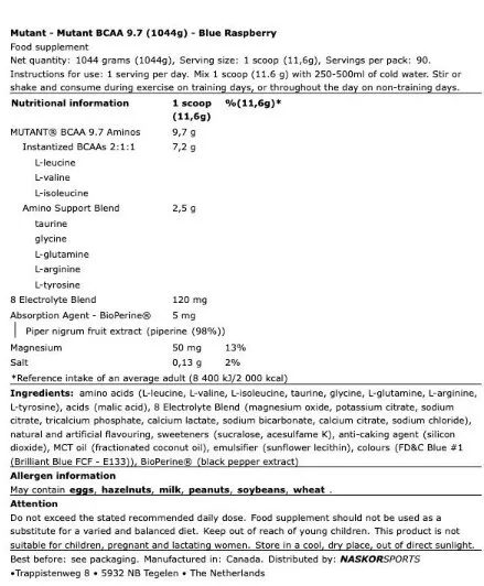 Mutant BCAA indeholder 9.7 gram BCAA af højeste kvalitet. Derudover indeholder hver portion 2.5 gram energi-givende aminosyrer. Aminosyrerne Taurin og Tyrosin kendes fra Red Bull, og hjæper til at give dig en følelse af energi, uden at du indtager koffein. Komplekset indeholder også L-Arginin.
