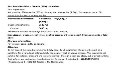 Best Body Creatine Capsules indeholder 880 mg kreatin monohydrat per kapsul.
