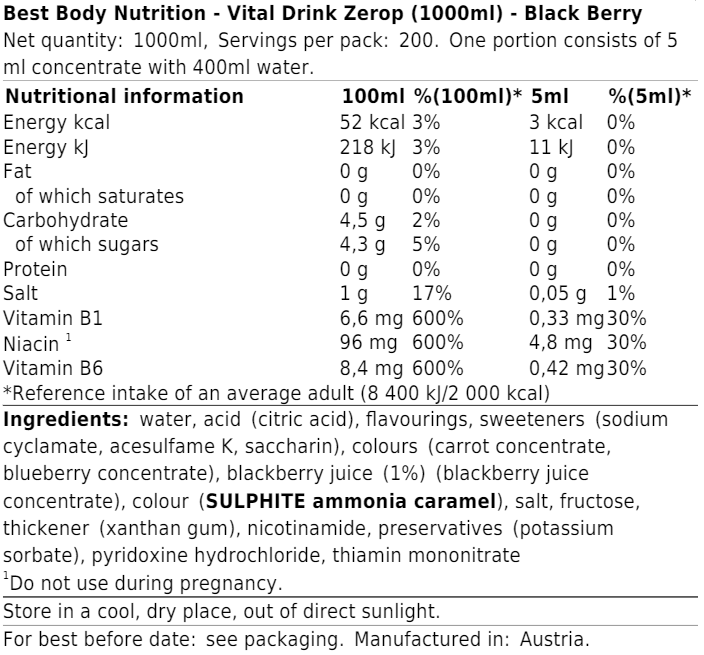 Food supplement. Content: 1000 ml Serving size: 0 5 ml Servings per Pack: 200 Recommended daily use: 1 Serving(s)