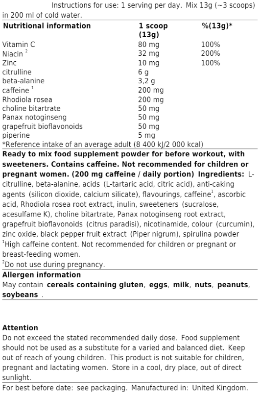 Drik 1 - 2 scoops 30 minutter før du træner. Drik gerne pulveret på tom mave. Husk at drikke en masse vand, for at få den bedst mulige virkning.