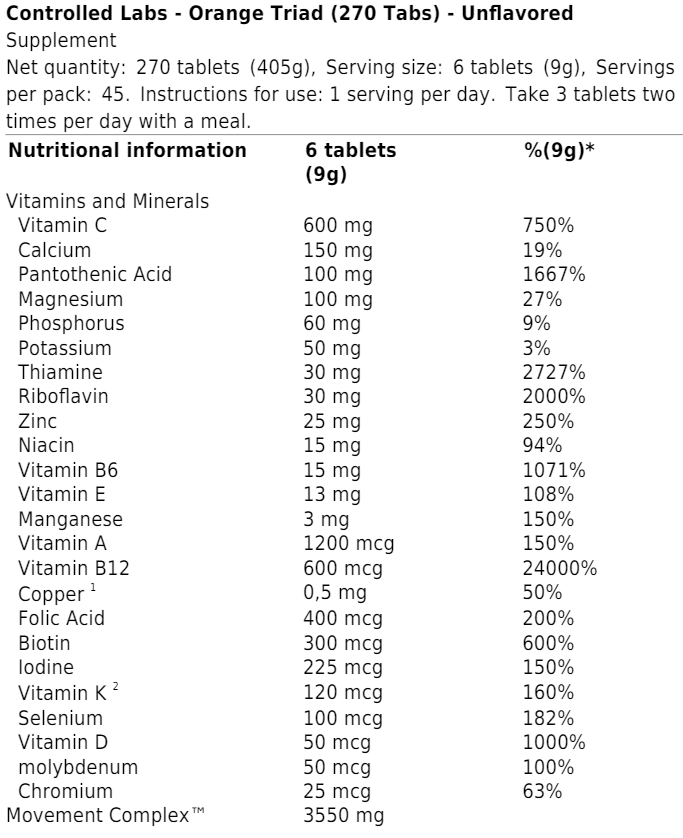 Orange Triad er det bedste supplement til seriøse atleter, og kombinerer de mest gennemprøvede og effektive vitaminer, mineraler og næringsstoffer for at understøtte optimal fordøjelse, immun- og ledsundhed i et "to gange dagligt" kosttilskud. Fælles- og bøjningskomplekserne hjælper med at smøre ledene, brusk og øge bindevævets modstandsdygtighed, mens fordøjelses- og immunkomplekset indeholder naturlige antiinflammatoriske midler, fordøjelseshjælpemidler og næringsdistributører for at tage din præstation til det næste niveau.