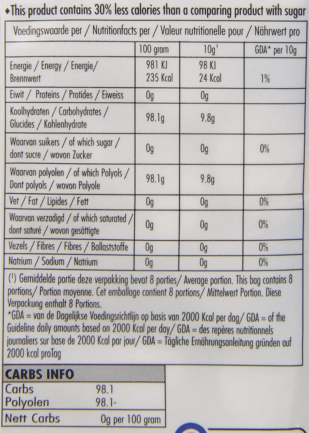 NUTRITION INFORMATION per 100g (bag is 80g): 235 kCal, Fat zero, Carbohydrates 98.1g of which sugars zero, polyols 98.1g, giving net carbs of zero, Fibre zero, Protein zero, Salt zero.