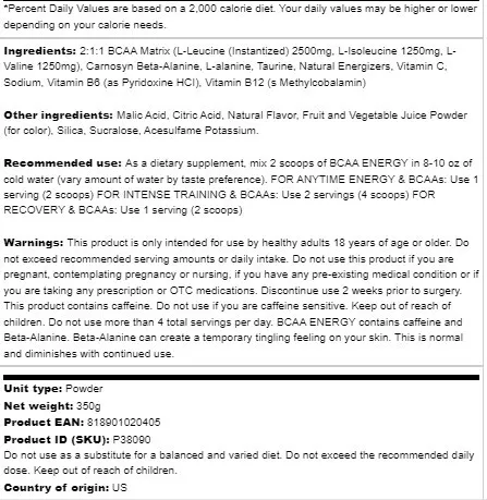 BCAA Energy kombinerer de forgrende aminosyrer BCAA med naturlige naturlige energikilder som kaffebønner og og grøn te ekstrakt. Produktet vil derfor give dig en øget restituering, en øget energi og en bedre træningspræstation.