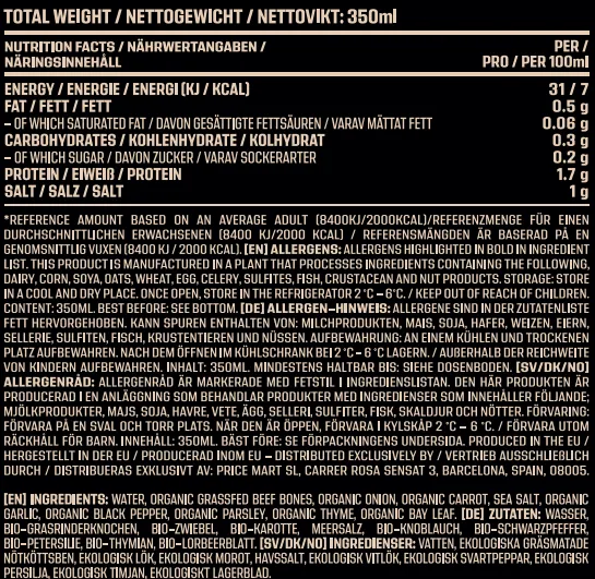- Rigt på smag: Vores fond koges langsomt på marvben, løg, urter, gulerødder, hvidløg, peber, persille, timian og laurbærblade. Denne sammensætning af ingredienser skaber en dyb og rig smag, der løfter enhver ret.