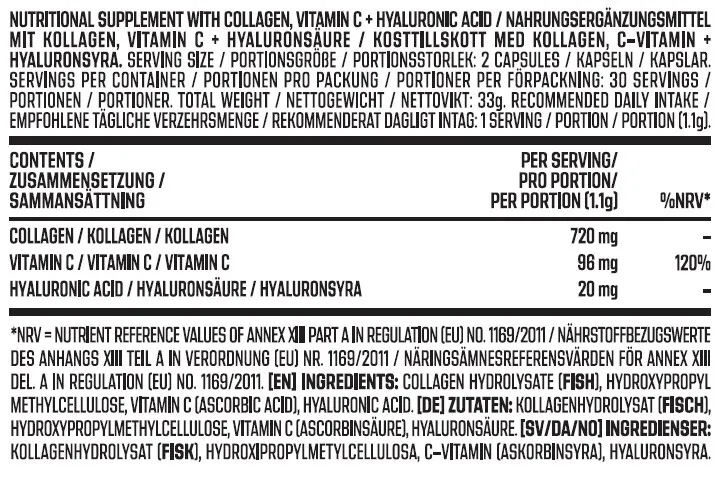 C-vitamin understøtter formationen af kollagen så vel som at yde støtte til dit immunsystem. En portion FITNESSNORD COLLAGEN, VITAMIN C & HYALURONIC ACID indeholder 120% af dit anbefalede daglige indtag. Hyaluronsyte hjælper til at holde din hud sund, fungtig og reducerer tegn på aldring. Sørg for du shiner med FITNESSNORD COLLAGEN, VITAMIN C & HYALURONIC ACID.
