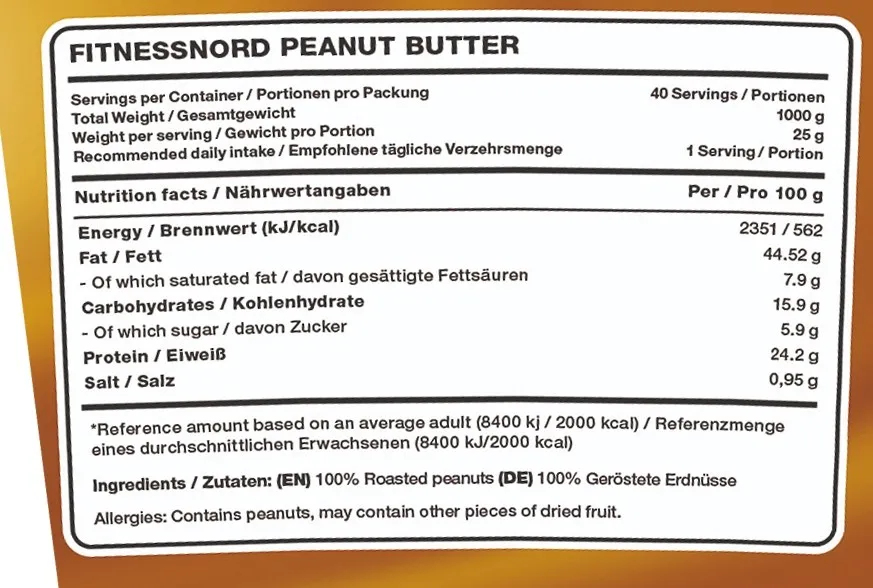 FitnessNord Creamy Peanutbutter er lavet 100% på ristede jordnødder, hvilæket svarer til 25% ren protein. Jordnødderne kabn desuden bidrage til at sænke blodtryk, hjertesundhed, holde blodsukkerniveauet ved lige, booste energi, mindske risikoen for kræft, reducere kolesterol og formindske inflammation.
