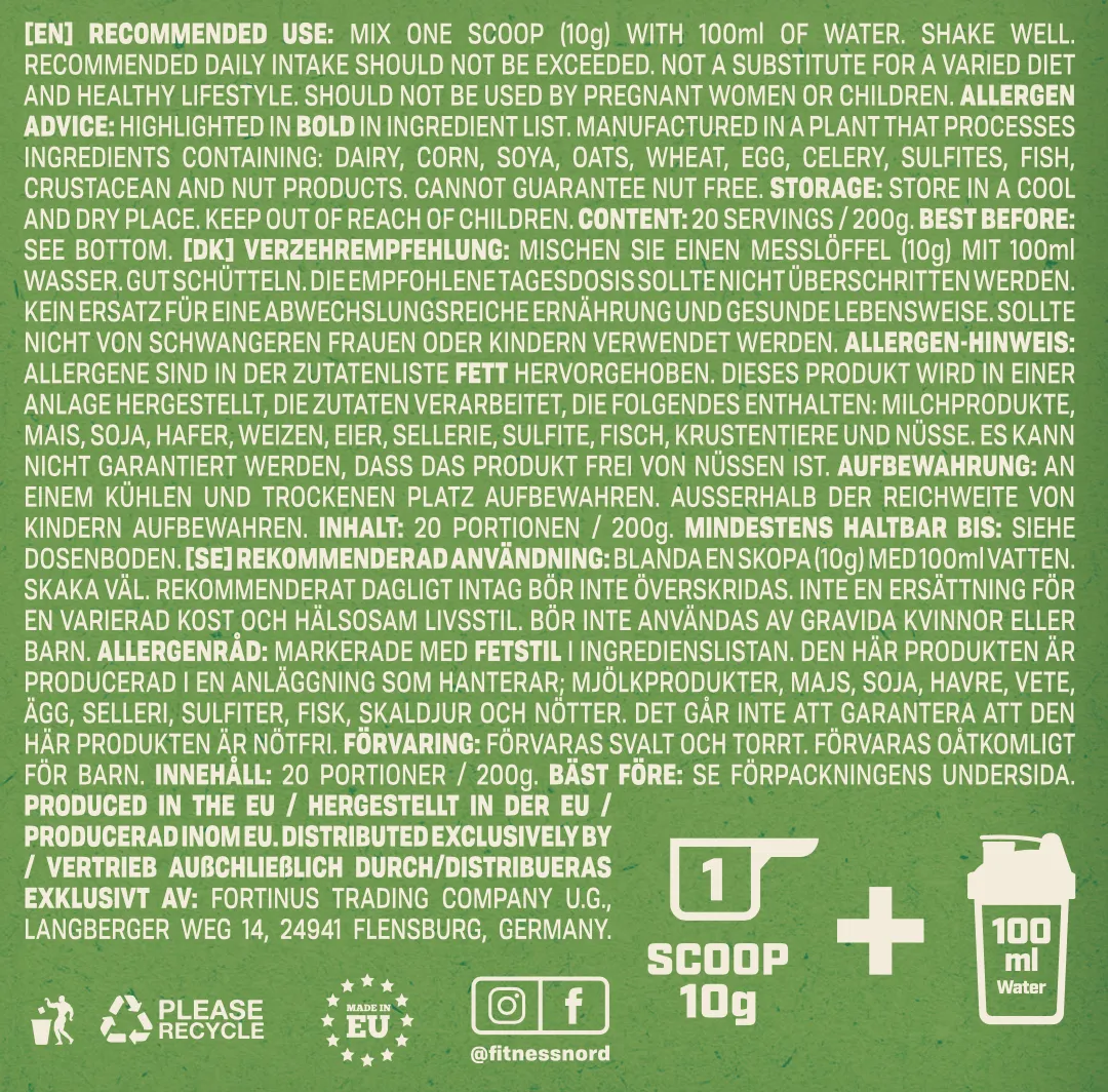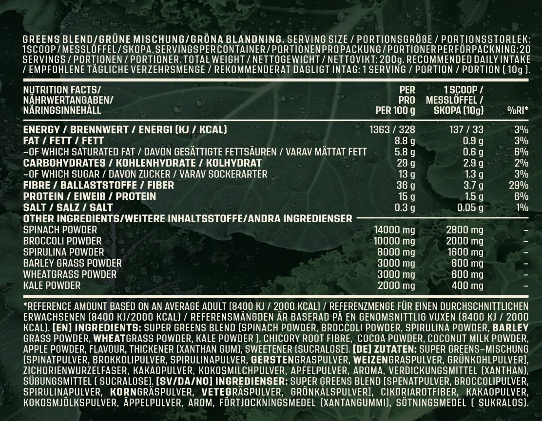 Revitaliser din daglige rutine med Fitnessnord Supergreens Blend. Fitnessnord Super Greens Blend er fyldt med en kraftfuld kombination af næringsrige ingredienser og er omhyggeligt fremstillet af et håndplukket udvalg af naturens fineste grøntsager, herunder spinatpulver, broccolipulver, spirulina-pulver, byggræspulver, hvedegræspulver og grønkålspulver. Hver ingrediens er omhyggeligt udvalgt for at give dig en koncentreret kilde til essentielle vitaminer, mineraler og antioxidanter.