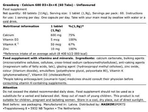 Calcium 600 D3 Zn K er et supplement til effektiv støtte til bevægeapparatet og hjerte-kar-systemet. Den indeholder calcium i kombination med zink, Vitaminer K og D3, der giver en synergistisk effekt og forbedrer calciumabsorptionen.