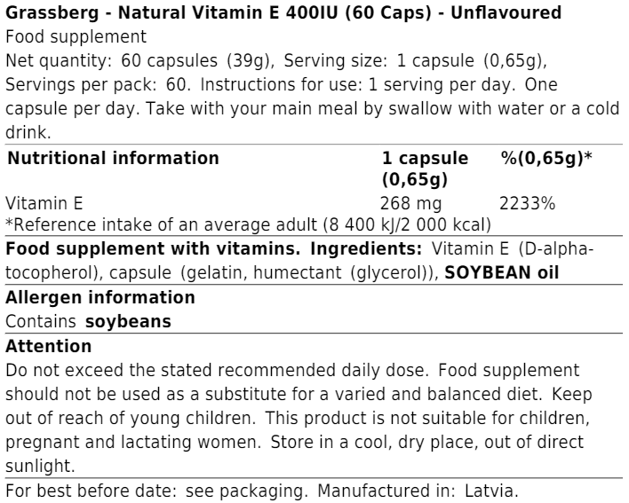 Vitamin E fra Grassberg er et naturligt kosttilskud, bestående af E-vitamin. Hver kapsul indeholder 400 IU af E-vitamin i d-alfa tocopherol. E-vitamin er en yderst kraftfuld fedtopløselig antioxidant.