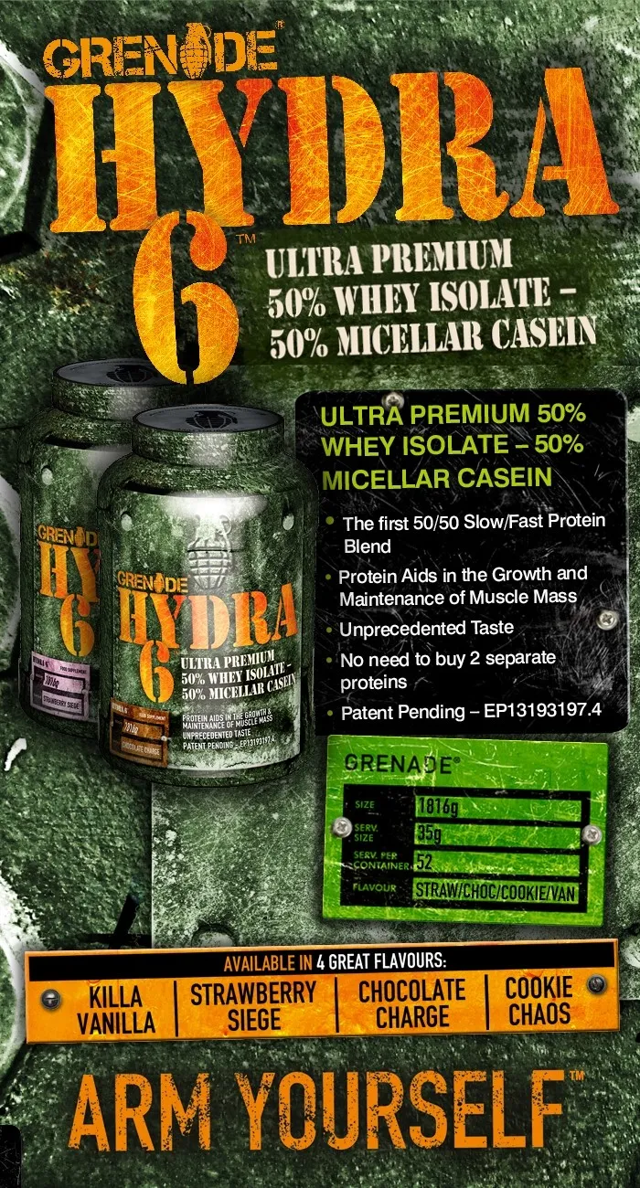 Hydra-6 fra Grenade er et proteinpulver af højeste kvalitet. Produktet indeholder en 50/50 fordeling af valleprotein isolat og ultrafiltreret micellær kasein. Proteinkilderne er dermed en kombination af hurtig- og langsomoptagelige proteinkilder, og er af absolut højeste kvalitet.