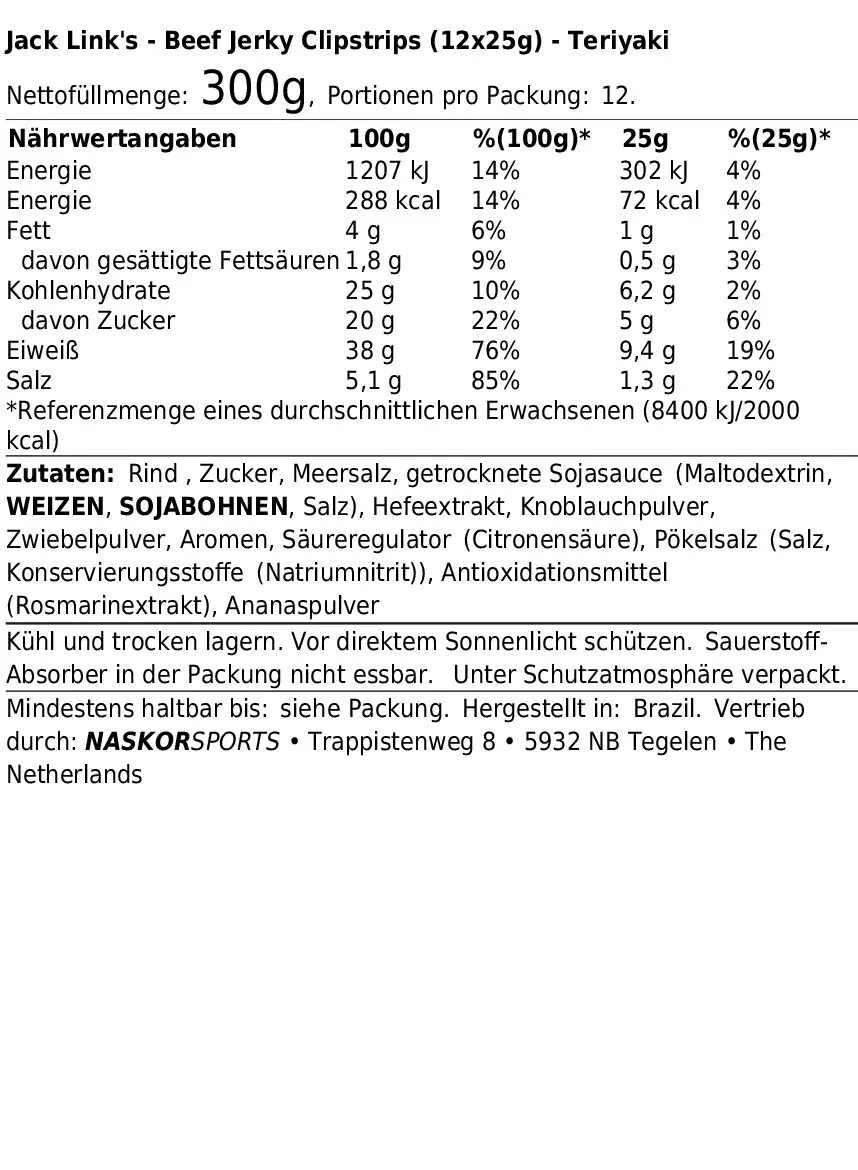 Jack Link's Beef Jerky er skiver af førsteklasses oksekød, der, krydret efter en gammel familieopskrift, langsomt lufttørres. Præcis 201g af det bedste oksekød kræves for at lave 100g Jack Link's Beef Jerky.