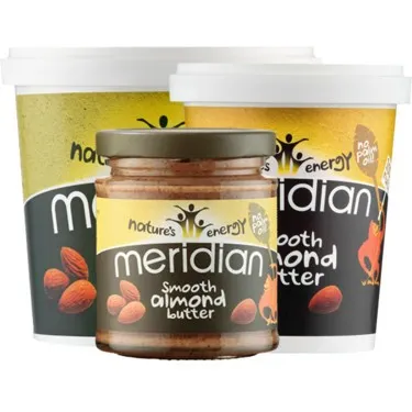 Almond Butter fra Meridian Foods består af 100% rent mandelsmør. Hver servering giver dig omkring 20% protein og har et lavt indhold af mættet fedt. Mandelsmøret indeholder ikke tilsat sukker, og er frit for gluten og gær.