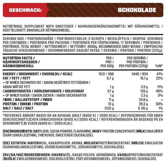 Pakket med fibre, med 21,2 gram pr. portion, for at fremme fordøjelsessundheden og holde dig mæt i længere tid. Vi har også inkluderet havremel som en kilde til kulhydrater med langsom frigivelse, der giver vedvarende energi hele dagen og hjælper med at opretholde stabile blodsukkerniveauer. Med 826 kalorier pr. portion, giver det din krop noget at arbejde med. Vi har også tilføjet solsikkelecithin som emulgator og fortykningsmiddel, hvilket sikrer en glat og lækker konsistens med hver tår. Nordic Choice Gainer fås i tre lækre smagsvarianter, der vil tilfredsstille dine smagsløg uden at gå på kompromis med ernæringen.