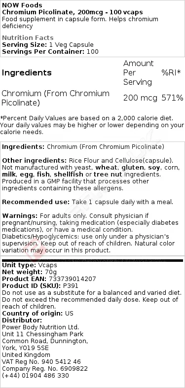 NOW FOODS CHROMIUM PICOLINATE, 200MCG - 100 VCAPS