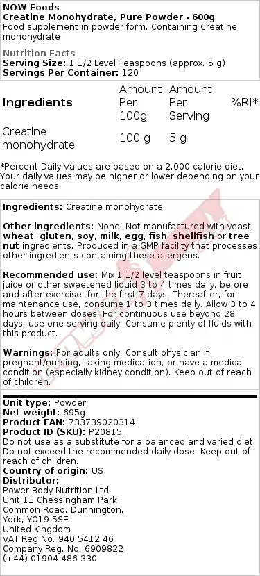 NOW FOODS CREATINE MONOHYDRATE, PURE POWDER - 600 GRAMS