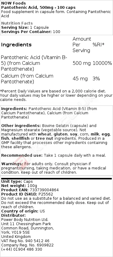 NOW FOODS PANTOTHENIC ACID, 500MG - 100 CAPS