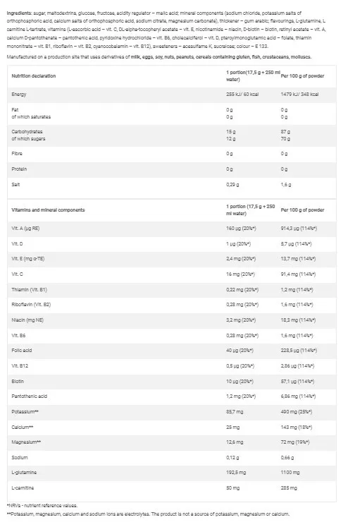 Anvendelse: Opløs 17,5g pulver = 1½ scoop i 250ml vand. Brug efter behov, især under konkurrence, intensiv træning og krævende fysisk aktivitet. bør drikkes lige efter tilberedning. Anbefalet daglig dosis bør ikke overskrides. Kosttilskud må aldrig erstatte alm. Varieret kost. Vi anbefaler en afbalanceret kost og sund livsstil. Opbevares ved stuetemperatur.