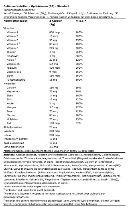 Produktet sikrer dig et optimalt indtag af vitaminer, mineraler og andre essentielle næringsstoffer, som er essentielle byggesten for din krop. Opti-Women sikrer dig et højt energiniveau, et øget immunforsvar og en bedre præstationsevne i træningscenteret. Produktet indeholder også en række planteekstrakter og antioxidanter som sikrer bidrager til øget velvære og en højere forbrænding.