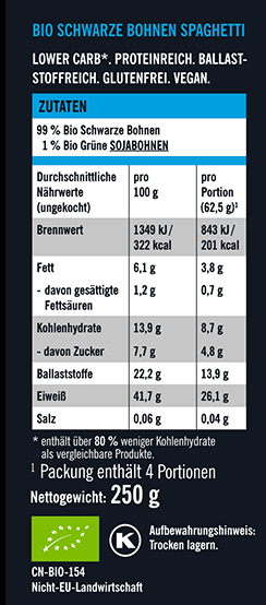 Sortbønner er blandt de ældste og sundeste fødevarer i verden og har været en del af madlavningen i Nord-, Syd- og Mellemamerika i tusinder af år. De er kendetegnet ved deres høje indhold af fibre og proteiner samt deres høje indhold af antioxidanter, samtidig med at de har få kalorier. Vores sorte bønne-nudler har en krydret og samtidig fin smag. Et særligt blikfang på tallerkenen.