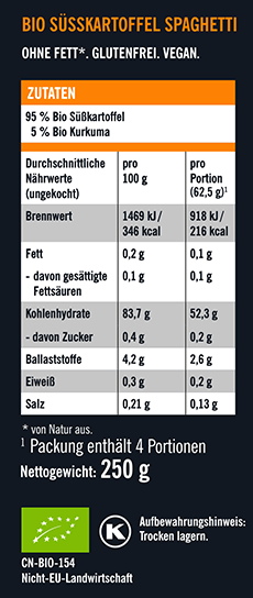 Søde kartofler betragtes som en af de sundeste og mest næringsrige grøntsager. Vores sød kartoffel-pasta er ideel til asiatiske retter, da den efter kogning får en konsistens, der minder om glasnudler. Vores orange spaghetti og violette fettuccine tilbyder en farverig smagsoplevelse for både børn og voksne. De har samme smag og adskiller sig kun i deres farve og form.
