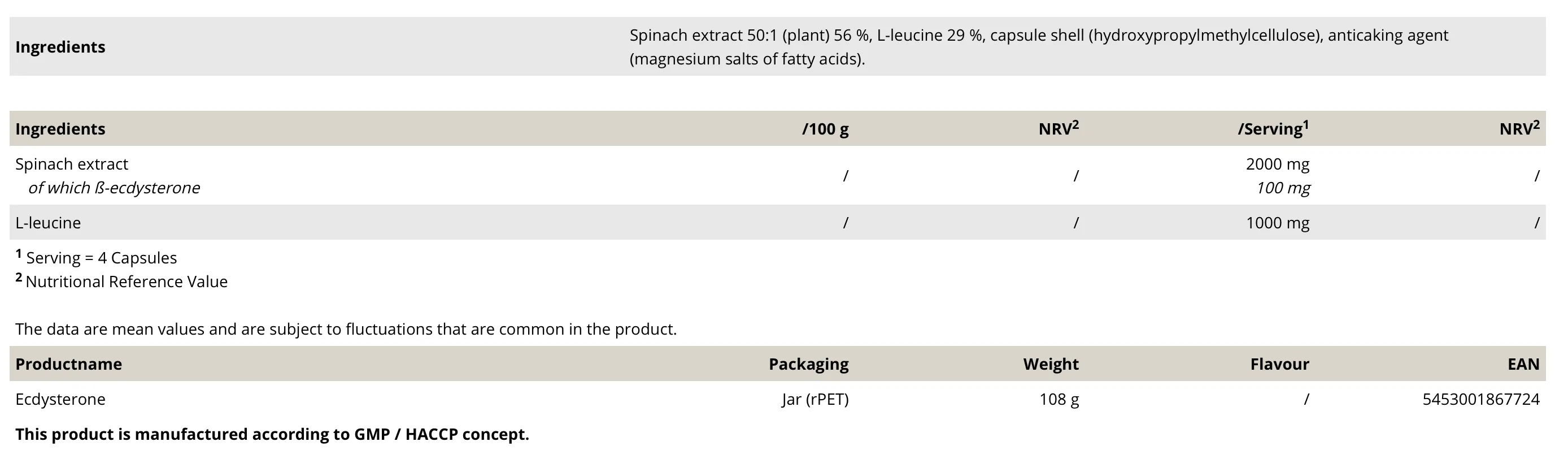 Det vegetabilske sterol ecdysteron kan være årsagen til, at Popeye aldrig forlod huset uden en dåse spinat. Steroler er steroidhormoner, som forekommer naturligt i dyr og planter. Spinat indeholder især relevante mængder af ecdysteron, hvilket er grunden til, at Peak Performance Products udvinder ecdysteron fra det. Ecdysteron giver 25 mg ecdysteron pr. kapsel plus 250 mg af den protein-dannende aminosyre leucin.