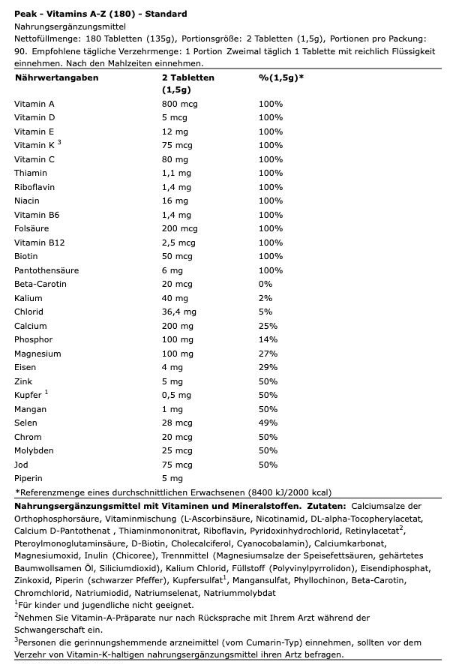 Peak Vitamins A-Z er et multivitamintilskud af høj kvalitet. Produktet giver dig alle 14 vitaminer og 14 mineraler dagligt. Produktet udarbejdet til dig som er fysisk aktiv, og derfor i højere grad har brug for et dækkende vitamintilskud.