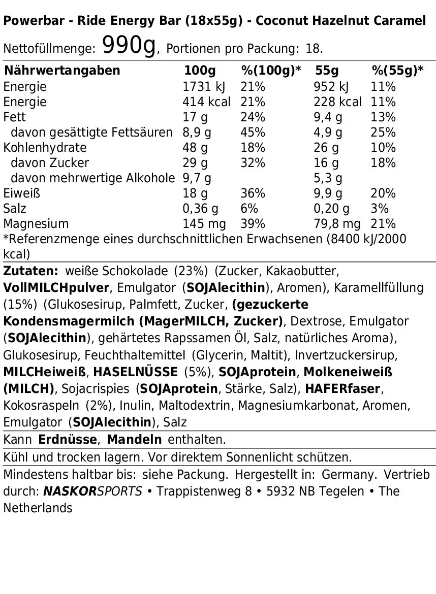 POWERBAR RIDE ENERGY BAR (18X55G) COCONUT HAZELNUT CARAMEL