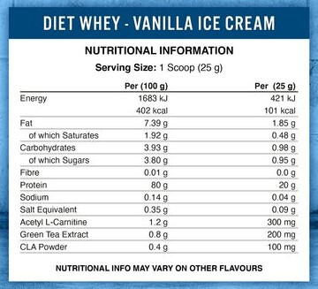 Whey Protein Blend (Milk) (95%) (Whey Protein Concentrate & Whey Protein Isolate), Natural Flavour, CLA Powder, Acetyl L-Carnitine, Green Tea Extract, Sweeteners (Sucralose, Stevia).