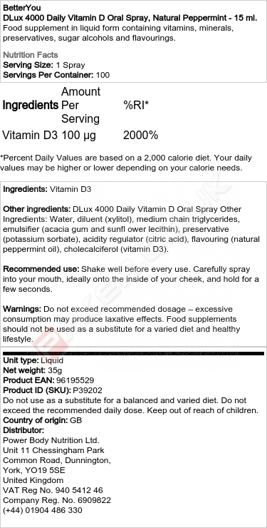 BETTERYOU DLUX 4000 DAILY VITAMIN D ORAL SPRAY, NATURAL PEPPERMINT - 15 ML.