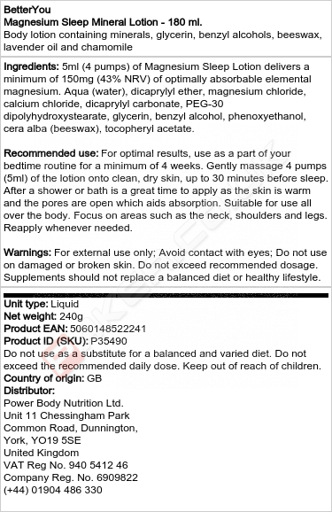 BETTERYOU MAGNESIUM SLEEP MINERAL LOTION - 180 ML.