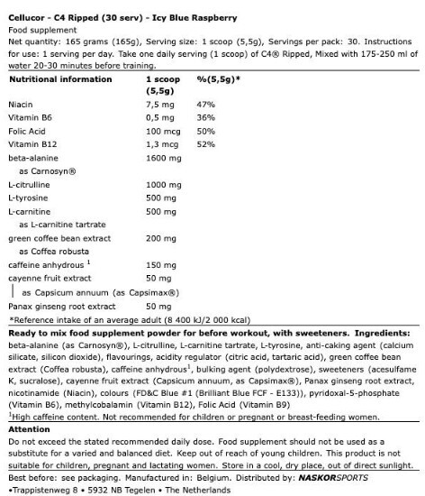 C4 Ripped är en multifunktionell pre-workout produkt. C4 Ripped är packad med koffein för att öka fokus och vakenhet, samt B2-, B3- och B12-vitaminer. Produkten innehåller ingredienser som L-carnitin, grön kaffe, panax ginseng, L-citrullin och L-tyrosin. Dessutom har den den patenterade extraktet från cayennefrukt, Capsimax®, som är extra potent.