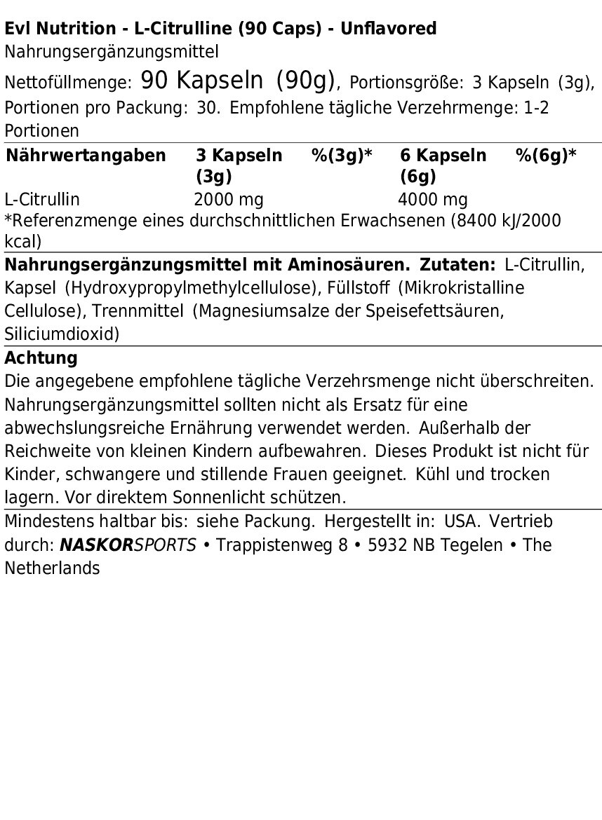 EVL NUTRITION L-CITRULLINE (90 CAPS)