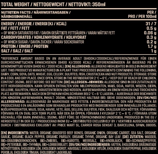 Oplev den autentiske smag af naturen med vores økologiske græsfodrede oksefond. Lavet med omhu af oksekød fra græsfodrede dyr, der lever frit på åbne marker, giver vores fond en unik og intens smag. Perfekt til at løfte dine retter til nye højder af smagsoplevelse. Tilføj en dybde af karakter til saucer, supper og gryderetter. Prøv vores økologiske græsfodrede oksefond i dag og oplev ægte smag uden kompromis