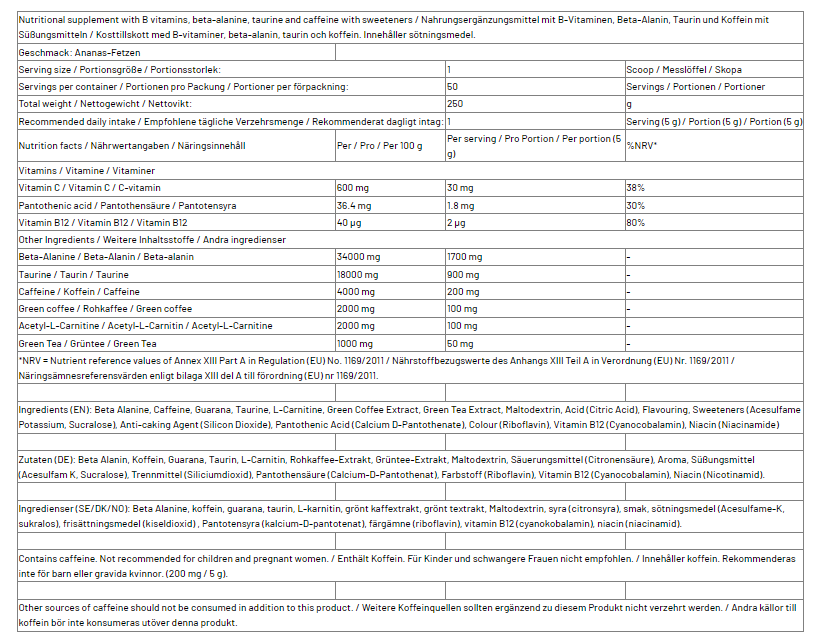 Produkten innehåller en klassisk pre-workout cocktail bestående av koffein, beta-alanin och B-vitaminer. Dessa ingredienser ger dig fokus och motivation att träna.