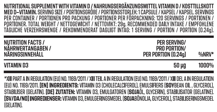 Vi introducerar våra banbrytande Fitnessnord Vitamin D3-kapslar, formulerade med en ren och bra källa av vitamin D3. Varje kapsel innehåller 50 μg (1000% dagligt värde) vitamin D3.