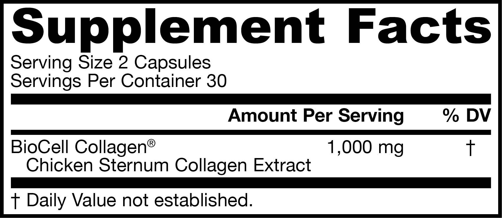 Produktet innehåller BioCell Collagen, som är en låg-molekylär och vattenlöslig komplex. Komplexet är utvunnet från kyckling bröstbenbrusk. Produktet kommer att hjälpa dig till friska leder och ökad fuktighet för din hud.