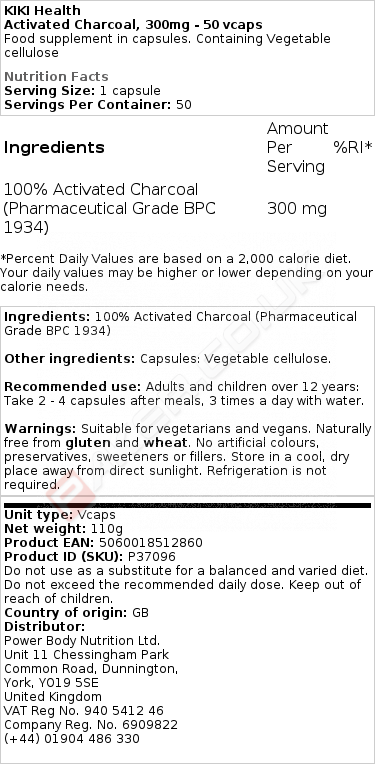 KIKI HEALTH ACTIVATED CHARCOAL, 300MG - 50 VCAPS