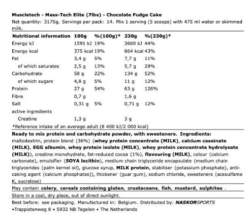 Muscletech Mass Tech är en weight gainer, som är rik på kolhydrater och protein. Mass Tech innehåller även nyttiga fettsyror, samt kreatin och aminosyror. Förhållandet mellan kolhydrat och protein är 1:4, och därför kan Mass Tech rekommenderas till dig som har en snabb ämnesomsättning. Mass Tech är även tillsatt med vitaminer, som är viktiga efter din träning.