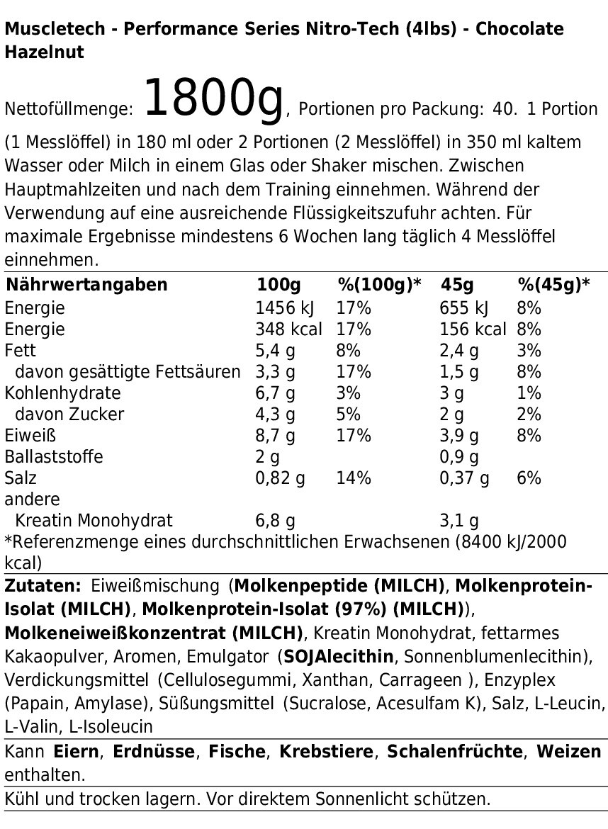 MUSCLETECH PERFORMANCE SERIES NITRO-TECH (4LBS) CHOCOLATE HAZELNUT