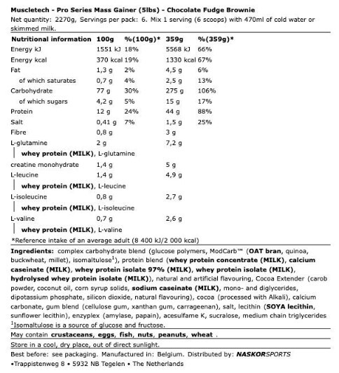 Pro Series 100 % Mass Gainer från MuscleTech är en muskeluppbyggande produkt av högsta kvalitet. Du får i varje portion hela 44 g protein av hög kvalitet, hela 278 g kolhydrater med 15 g socker och 3 g fibrer och 4,5 g fett. Totalt ger produkten dig 1330 kalorier och är därför perfekt för dig som behöver extra kalorier eller har svårt att gå upp i vikt. Sammanfattningsvis är denna gainer perfekt för dig som vill bygga upp en betydande mängd muskelmassa med bra ingredienser.