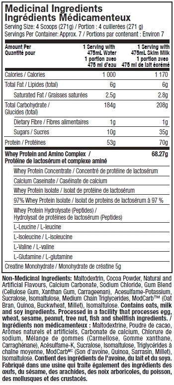 Pro Series 100 % Mass Gainer från MuscleTech är en högkvalitativ muskeluppbyggande produkt. I varje portion får du hela 44 g protein av hög kvalitet, hela 278 g kolhydrater med 15 g socker och 3 g fiber samt 4,5 g fett. Totalt ger produkten dig hela 1330 kalorier, vilket gör den idealisk för dig som behöver extra kalorier och för dig som har svårt att gå upp i vikt. Sammanfattningsvis är denna gainer perfekt för dig som vill bygga upp en markant mängd muskelmassa med bra ingredienser.