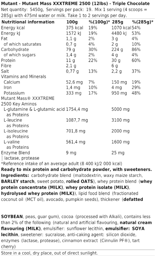 Mutant Mass 2500 är baserad på kolhydrater som är lätt för din kropp att absorbera och från naturliga livsmedel, och varje portion innehåller 12 gram fiber, som ger optimal absorption och matsmältning. Kolhydraterna består huvudsakligen av maltodextrin, vilket transporteras snabbt genom systemet utan att orsaka besvär med magen, kombinerat med bland annat sötpotatis och havregryn.