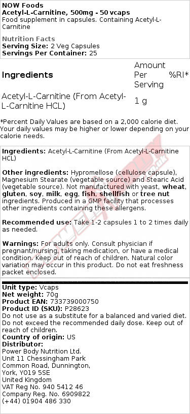 NOW FOODS ACETYL-L-CARNITINE, 500MG - 50 VCAPS