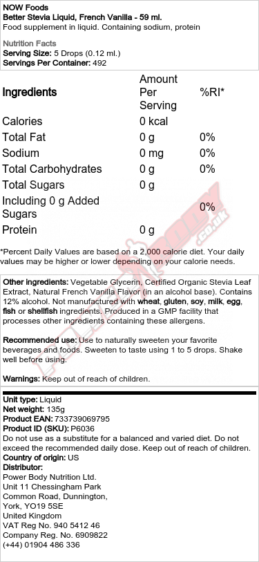 NOW FOODS BETTER STEVIA LIQUID, FRENCH VANILLA - 59 ML.