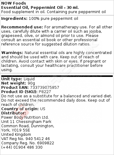 NOW FOODS ETERISK OLJA, PEPPARMYNTSOLJA - 30 ML.